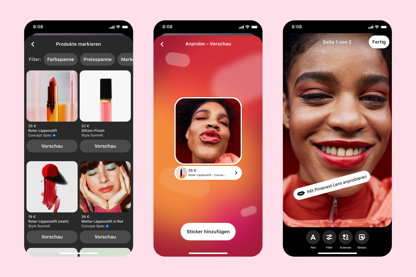 Pinterest sorgt dafür, dass die Ideen auf Idea Pins noch kaufbarer werden: durch die Integration mit der Funktion AR Try on, einer Möglichkeit Beauty-Produkte virtuell anzuprobieren. Dank dieser neuen Option können Creators ihre Idea Pins mit einem neuen „Try on“-Sticker für Lippen- und Augenprodukte markieren. Nutzer*innen in den USA können schon jetzt das Produkt virtuell anprobieren und direkt über den Idea Pin kaufen. Creator können einfach den „Try on“-Sticker auswählen, über 10.000 Produktlinks zum Anprobieren durchsuchen und den passenden zum Idea Pin hinzufügen.